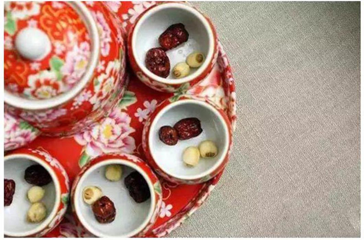 传统婚礼讲究的是好意头,讲究福泽家旺,一般准备普通的铁观音或普洱,每杯茶里放一双不去皮的莲子,代表着喜结连理,还会放一双红枣,代表着鸿运当头、早生贵子,寓意有个好兆头。