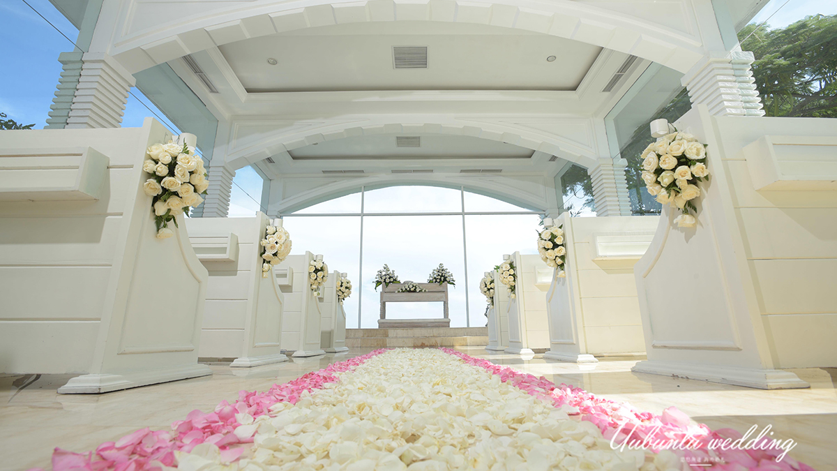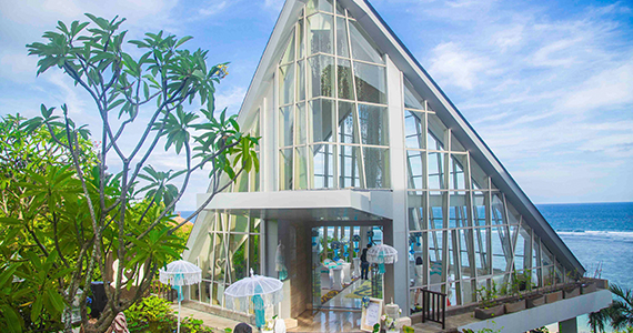 蓝点弯教堂婚礼Bluepoint——蓝点小礼拜教堂位于距离机场40分钟车程的印度尼西亚巴厘岛的Uluwatu(乌鲁瓦图)悬崖上。 BluepointChapel(蓝点教堂)隶属于蓝点湾酒店,而酒店正是因为其壮观的无边泳池及四面玻璃教堂而闻名海内外。 “蓝点”拥有无敌的浪漫海景,山崖下是著名的冲浪圣地。时尚纯白风格的蓝点湾教堂伫立在这梦境般的海湾上, 挑高的礼堂及四周的玻璃帷幕,教堂呈现如同水晶般的透亮,所以又称玻璃教堂。