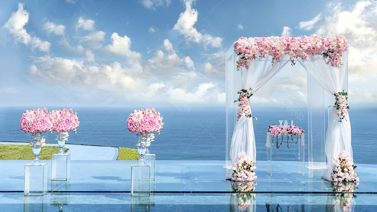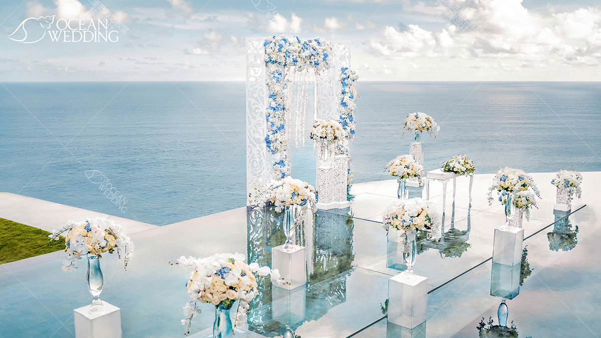 天空之镜的水之平台婚礼以昂贵的姆贝石修建,特殊的色彩与水面会形成一面天 空之镜,在不同的时间和天空下,把一切美丽的景象在水中倒映的清晰透明,与 悬崖下的海面融为一体,270°的环绕海景美得让人忘记呼吸,远远一条海平线将 大海与天空分隔开来。对于宣誓厮守一生承诺的新人来说,绝对是一个完美的画 面。水之平台婚礼一直被众多新娘所钟爱,,你的美丽婚礼,心爱的爱人,都在 这天空之镜下变得更加的浪漫美丽。尽情享受你梦幻般的婚礼,在这最神奇的位 置上、在亲密僻静的婚之中,牵手与亲吻时多了些温柔,相拥而视,一念即永恒, 完美捕捉这隆重时刻与毕生难忘的回忆。